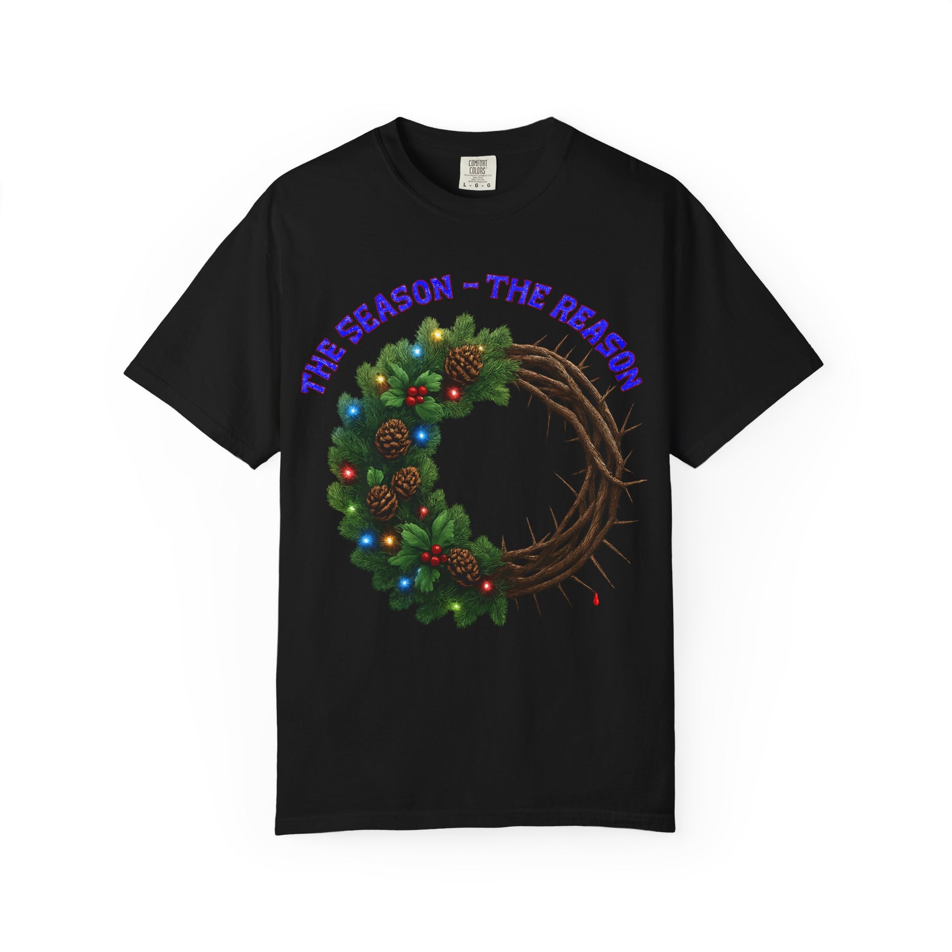 Soft, relaxed, and thoughtfully made — this garment-dyed tee blends everyday comfort with a quietly bold holiday statement. The front art pairs a traditional evergreen wreath with a crown of thorns motif and subtle string lights, creating a reflective, layered design that invites conversation without shouting. Wear it on slow winter mornings, at small seasonal gatherings, or while wrapping gifts; the breathable 100% ring‑spun cotton and medium-weight fabric keep you comfortable under layers or on its own. Tubular construction and double-needle stitching give the shirt a clean silhouette and lasting durability, while the garment-dyed finish offers a lived-in color and texture that softens with each wash. Available in a wide range of colors and sizes, this relaxed-fit tee sits easily in wardrobes that favor meaningful, understated pieces for holiday moments and quiet observance.