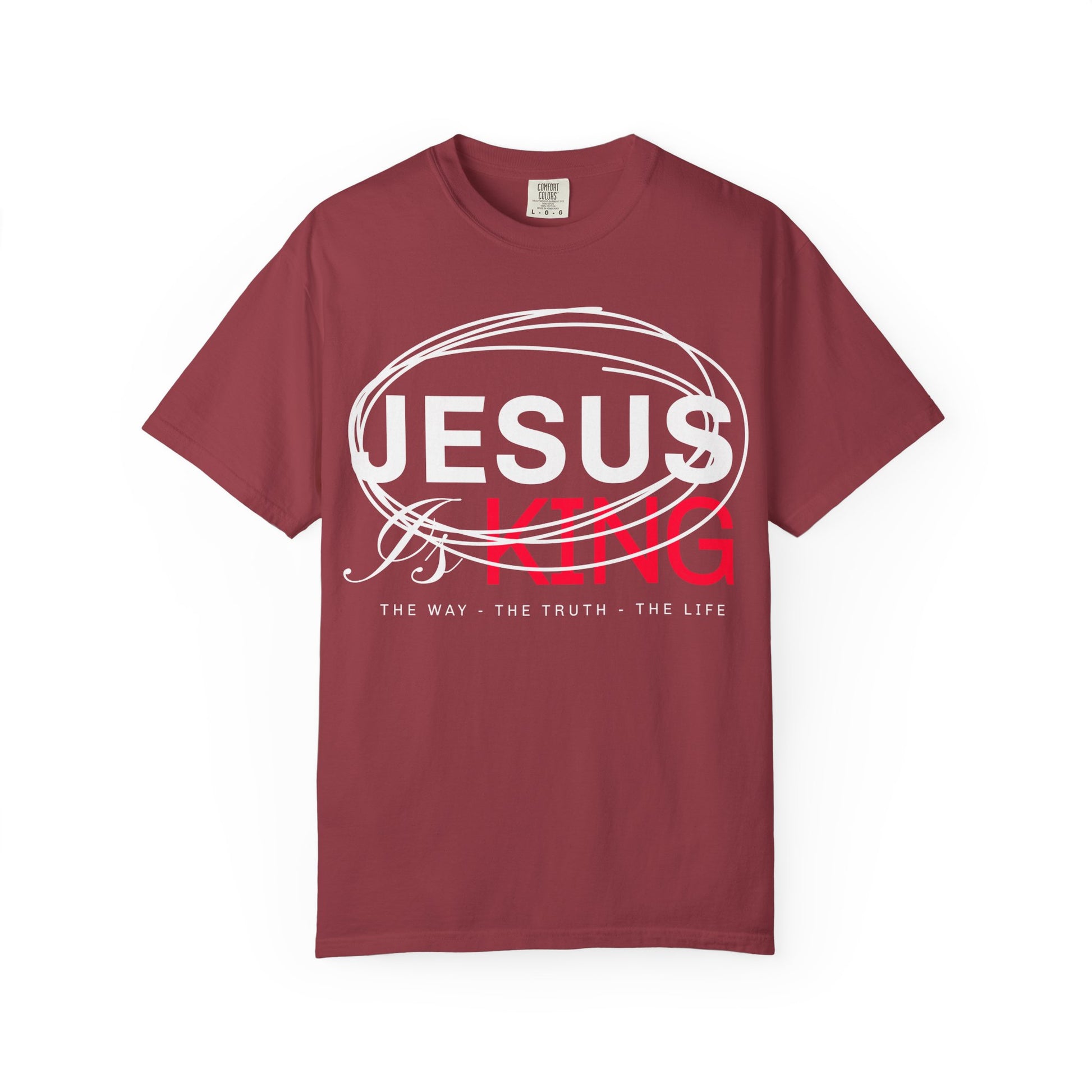This dynamic design proclaims “JESUS IS KING” with bold typography and layered styling. “JESUS” is encircled by energetic strokes, while “IS” flows in cursive and “KING” lands with bold impact. Beneath it all, the phrase “THE WAY – THE TRUTH – THE LIFE” anchors the message in scripture. It’s a visually engaging tribute to Christ’s authority and identity—perfect for believers who want to wear their faith with style and conviction.