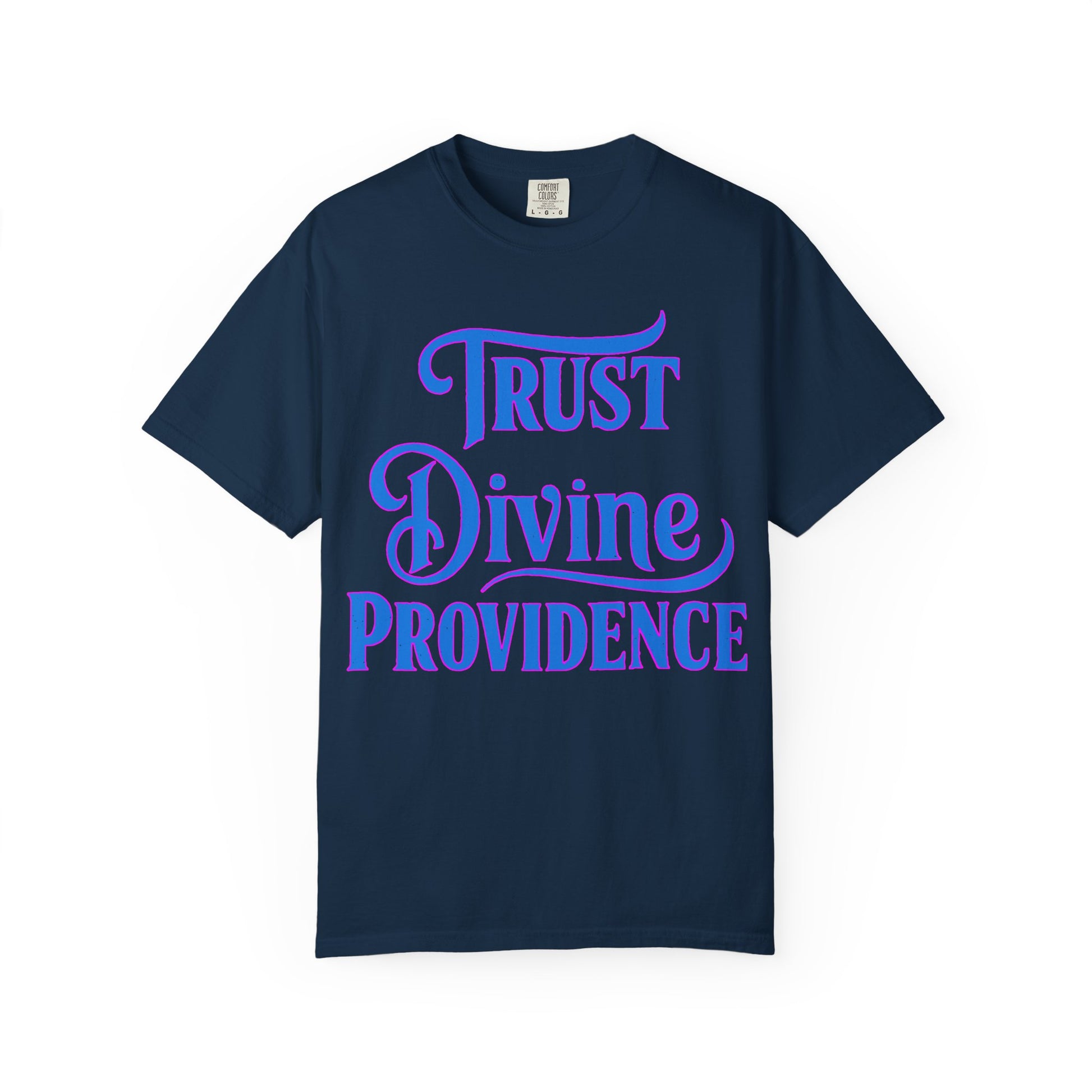 This radiant typographic design commands attention with its bold message: “Trust Divine Providence.” The swirling purple-to-blue gradient against a deep navy backdrop evokes mystery and majesty, while the ornate lettering adds a touch of reverence. It’s a visual sermon in three words—reminding viewers to lean into faith, even when the path ahead feels uncertain.