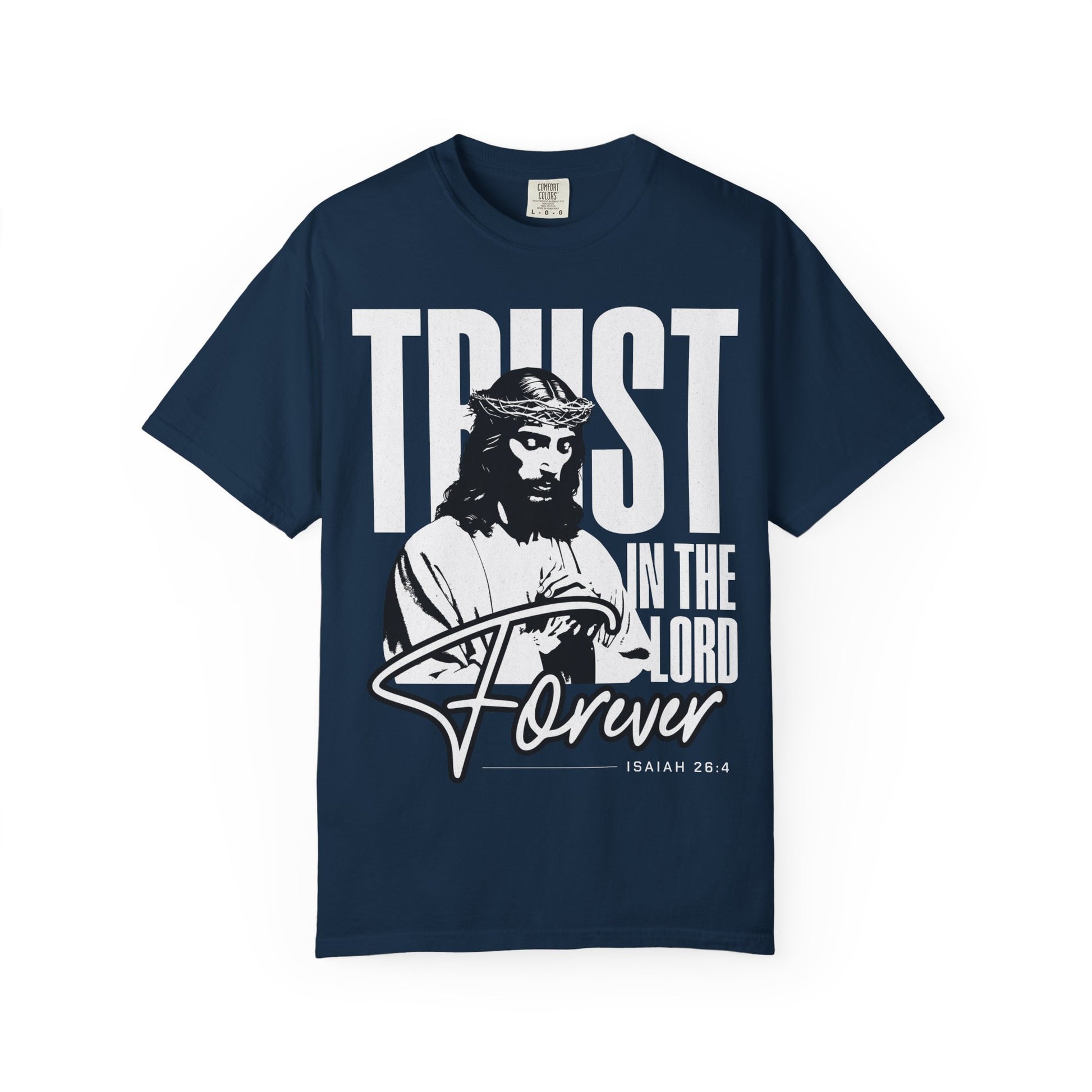 A stylized illustration of Jesus Christ wearing a crown of thorns stands in solemn prayer. Behind him, bold white text declares "Trust In The Lord Forever" with a reference to Isaiah 26:4. The composition blends reverence and strength, emphasizing unwavering faith and divine trust. The artwork evokes spiritual depth and commitment, making it a powerful visual statement for believers seeking encouragement and hope.