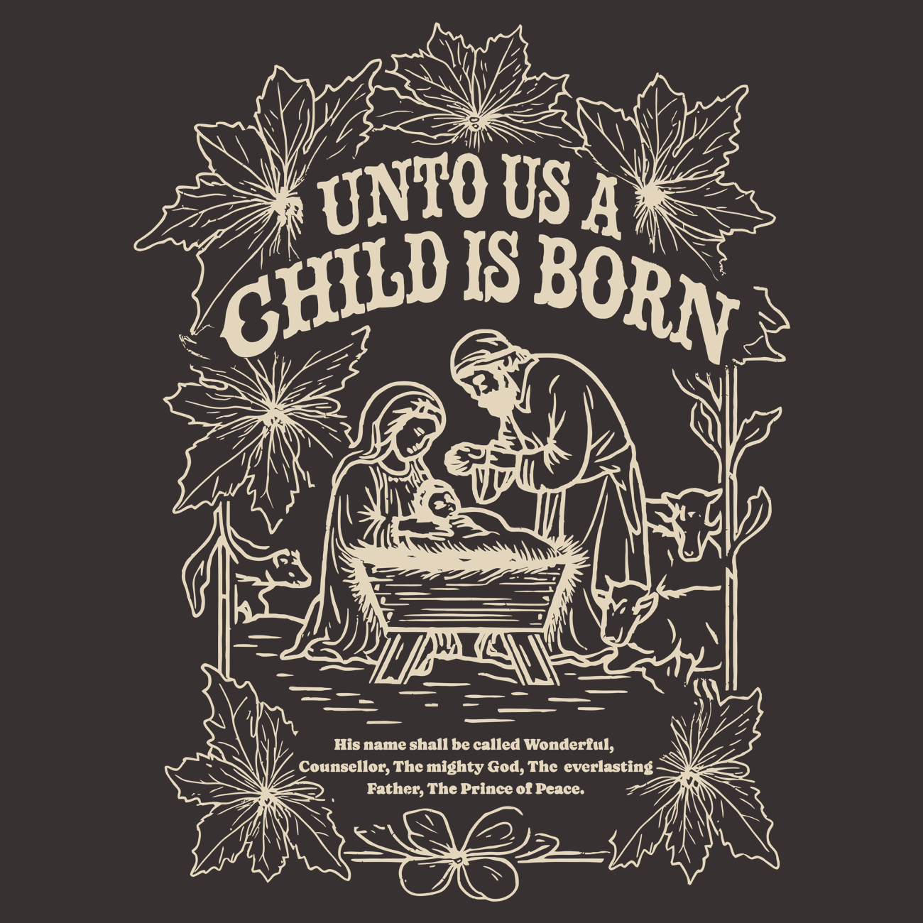 This design beautifully illustrates the nativity scene with Mary and Joseph adoring the newborn Jesus in a manger, framed by vibrant poinsettia flowers and leaves. The text proclaims “Unto Us a Child Is Born” alongside the prophecy from Isaiah: “His name shall be called Wonderful, Counsellor, The mighty God, The everlasting Father, The Prince of Peace.” A striking faith-inspired Christmas shirt, it blends scripture, tradition, and artistry into a bold, conversation-starting graphic.