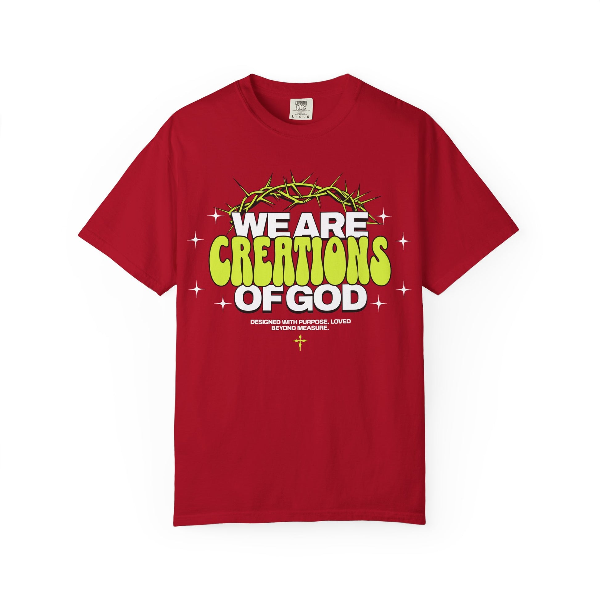 A bold graphic features the phrase "We Are Creations Of God" in layered fonts. A green crown of thorns sits above the message, with "Creations" in large bubble letters. Below, smaller text reads "Designed With Purpose, Loved Beyond Measure" and a yellow cross anchors the design. The composition blends playful typography with spiritual depth, celebrating divine identity, love and intentional design in a vibrant, faith-driven statement.