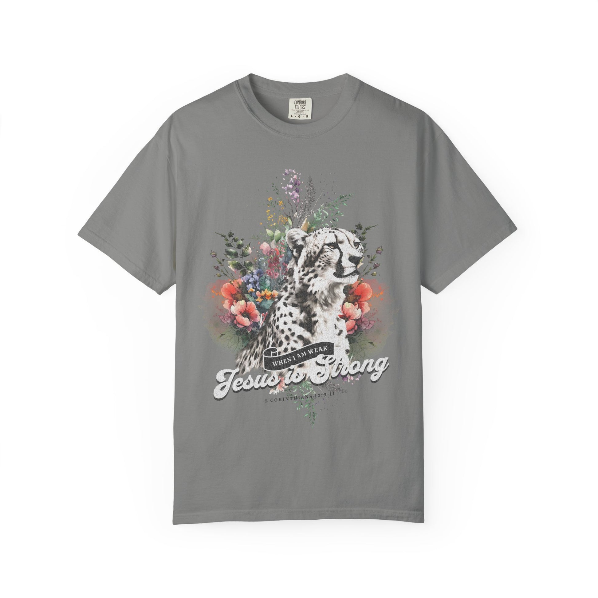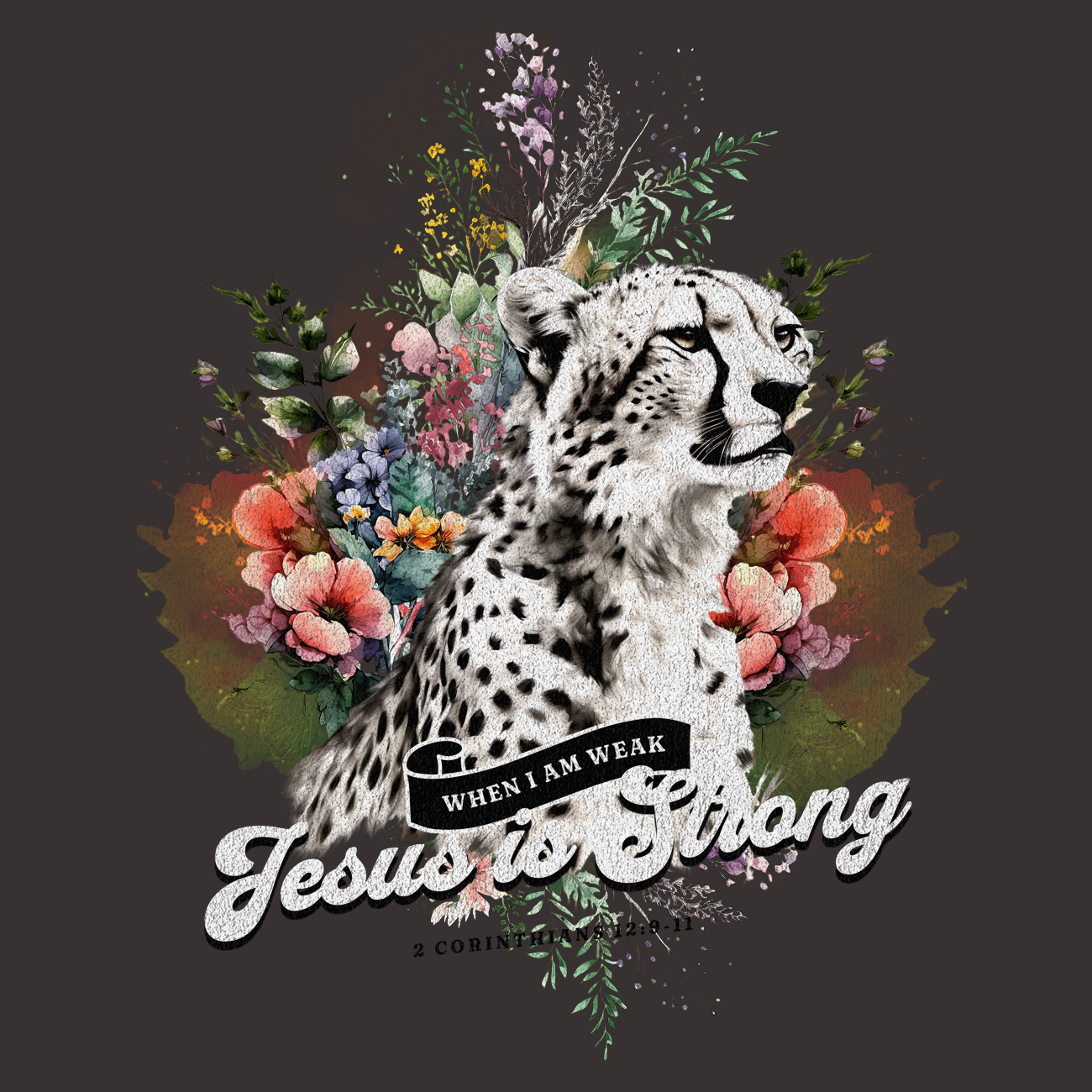 A cheetah stands tall with its head lifted, surrounded by vibrant flowers and foliage. Above the illustration, a banner reads "When I Am Weak" and below, stylized script declares "Jesus Is Strong" with a reference to 2 Corinthians 12:10. The composition blends natural beauty with spiritual strength, emphasizing divine power in moments of vulnerability. This design offers a bold and graceful statement of faith and reliance on Christ.