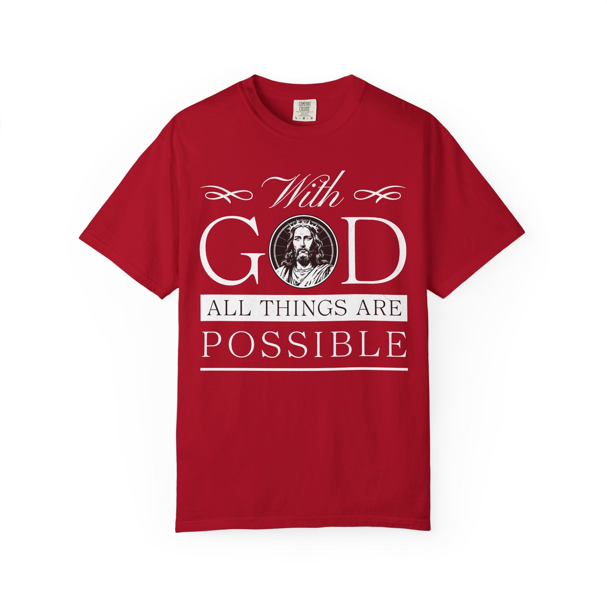 This relaxed, garment-dyed tee carries a quiet, steady faith. The front print reads “With God all things are possible,” framed with subtle vintage flourishes and a small devotional portrait—simple, sincere, and easy to wear to church, Bible study, or casual days when you want your faith on display without shouting. The soft, pre-shrunk ring-spun cotton and garment-dyed finish give the shirt a lived-in feel that drapes gently and keeps its color wash after wash. It’s the kind of shirt you reach for when you want comfort and a calm reminder of hope and perseverance.